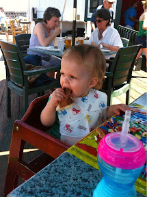 We’re getting a couple of floors refinished this week. Today was day 1 of 4. Today I slept like a rock for two hours while they noisily sanded and put in some spiffy wood grates. As soon as I woke up mom whisked us off to lunch where I ate some grilled cheese. I’m getting two more teeth and the Advil had worn off so I couldn’t be coaxed to smile.