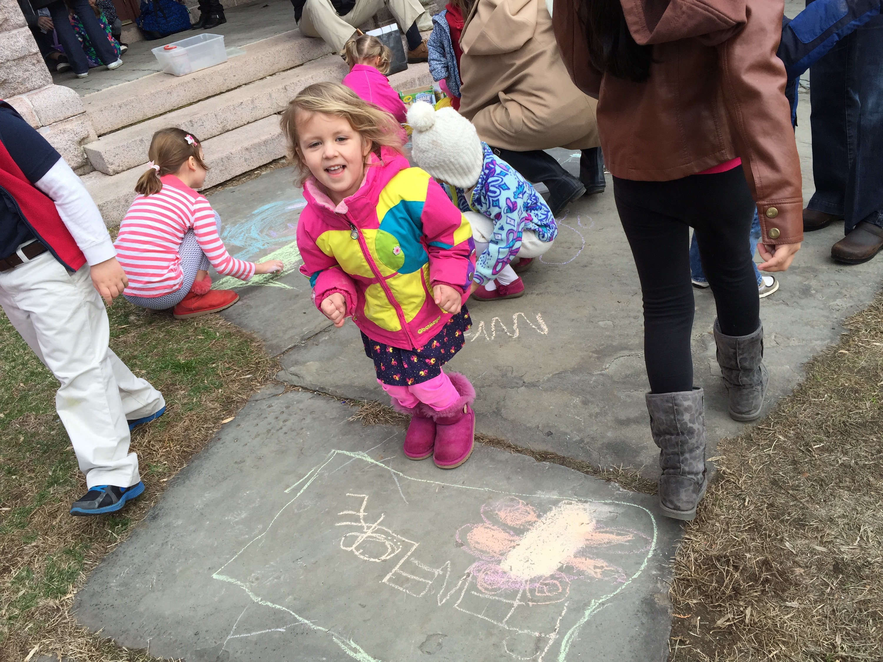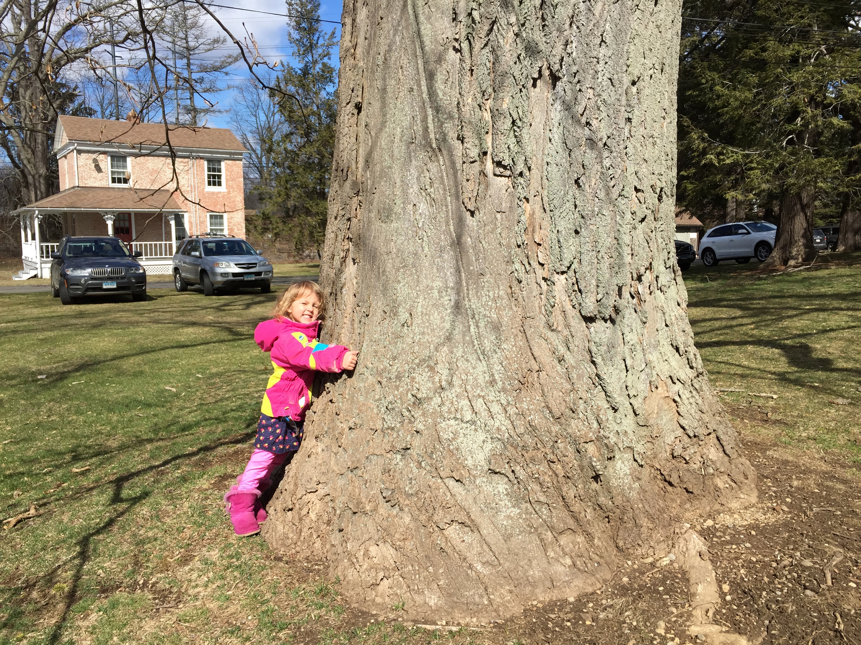 Today we went to the Pequot Library Easter Egg Roll–just like the one they have on the lawn of the White House. First we met the Easter bunny, then we dyed a couple of eggs, and petted a real bunny. Then we got down to business to warm up for the Easter egg rolling contest. We warmed up by climbing trees!