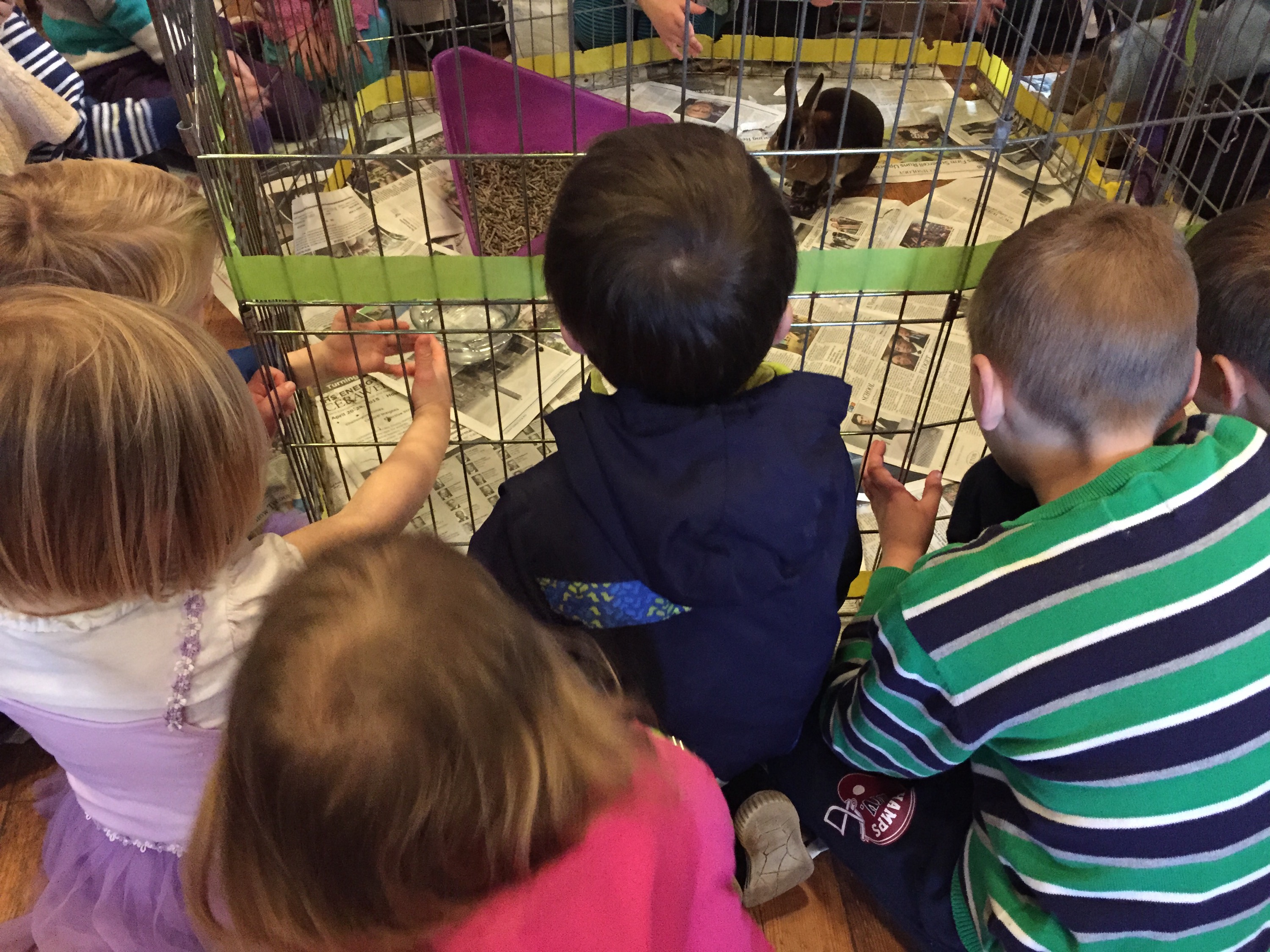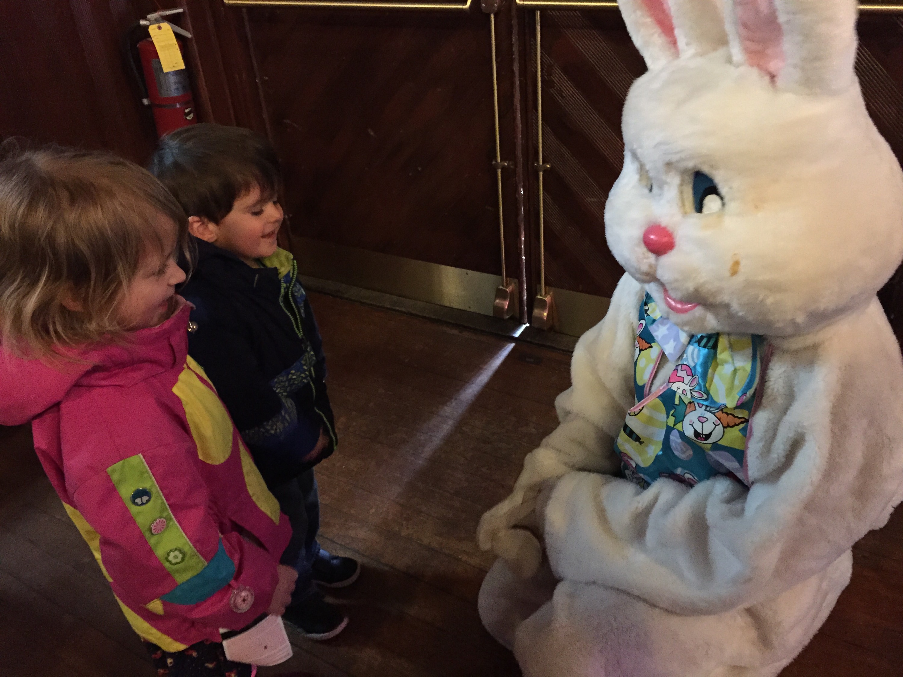 Today we went to the Pequot Library Easter Egg Roll–just like the one they have on the lawn of the White House. First we met the Easter bunny, then we dyed a couple of eggs, and petted a real bunny. Then we got down to business to warm up for the Easter egg rolling contest. We warmed up by climbing trees!