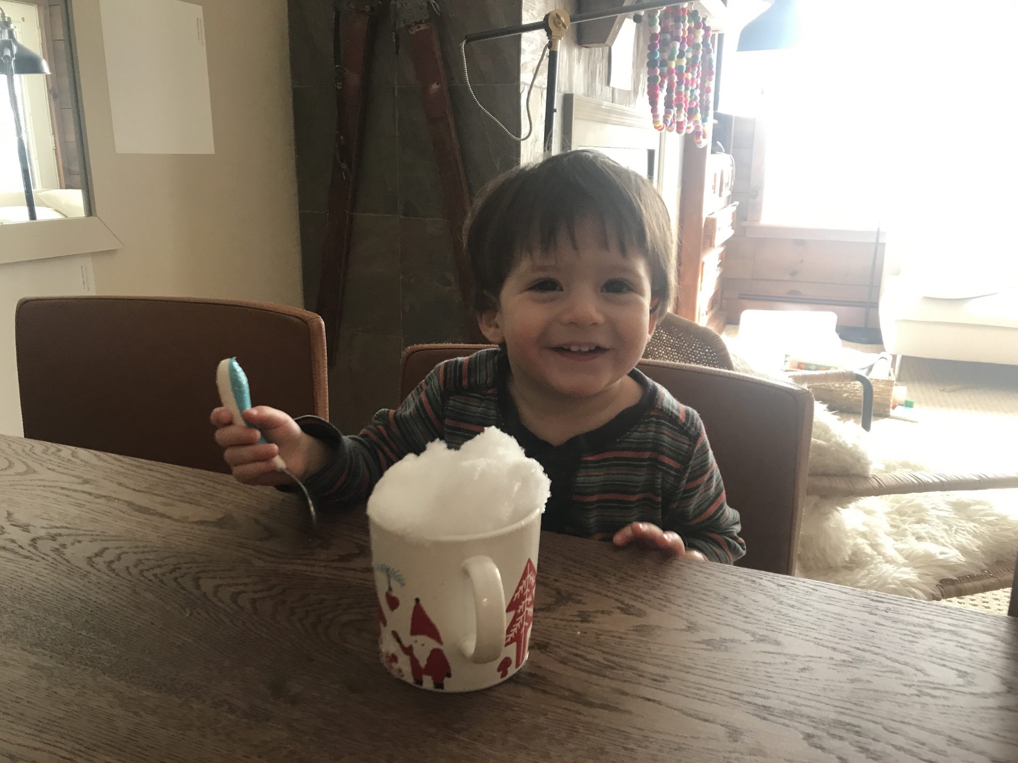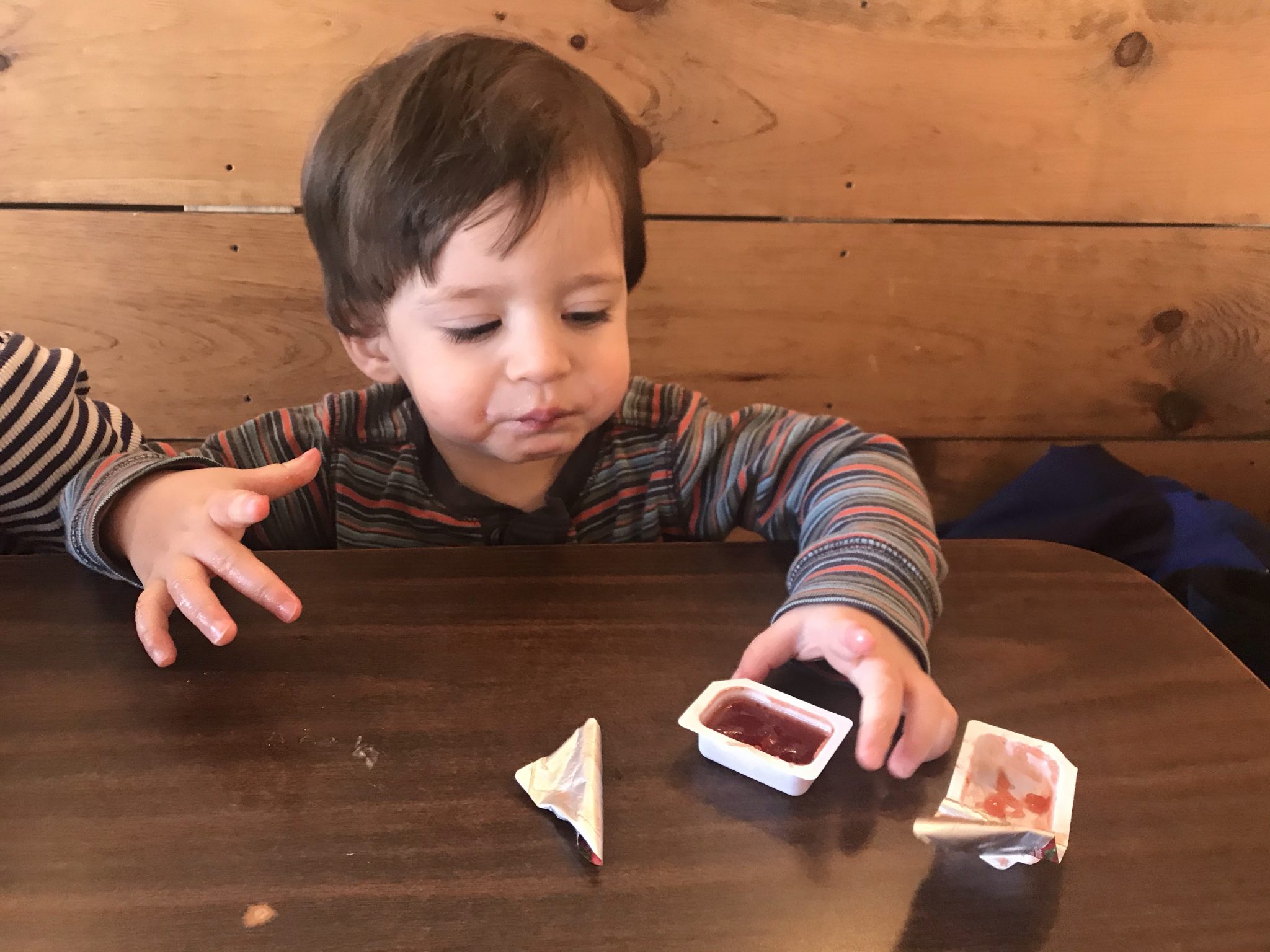 Harry has discovered jam packets…. he opened them on his own. He has also developed a taste for snow (in the mug in the video)