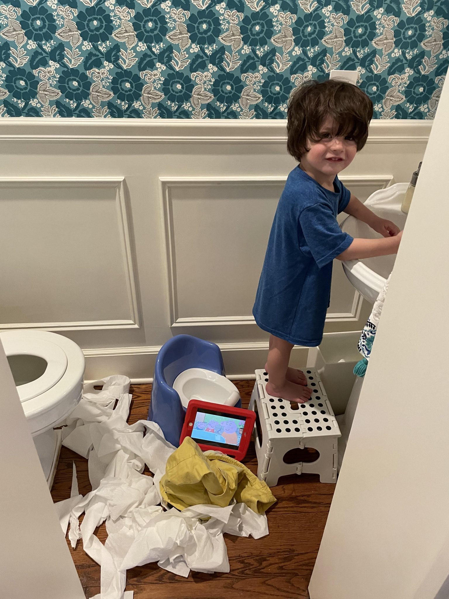 Harry is keeping a tradition in the family: unrolling a whole roll onto the floor! But too handsome to punish! And that smile…..