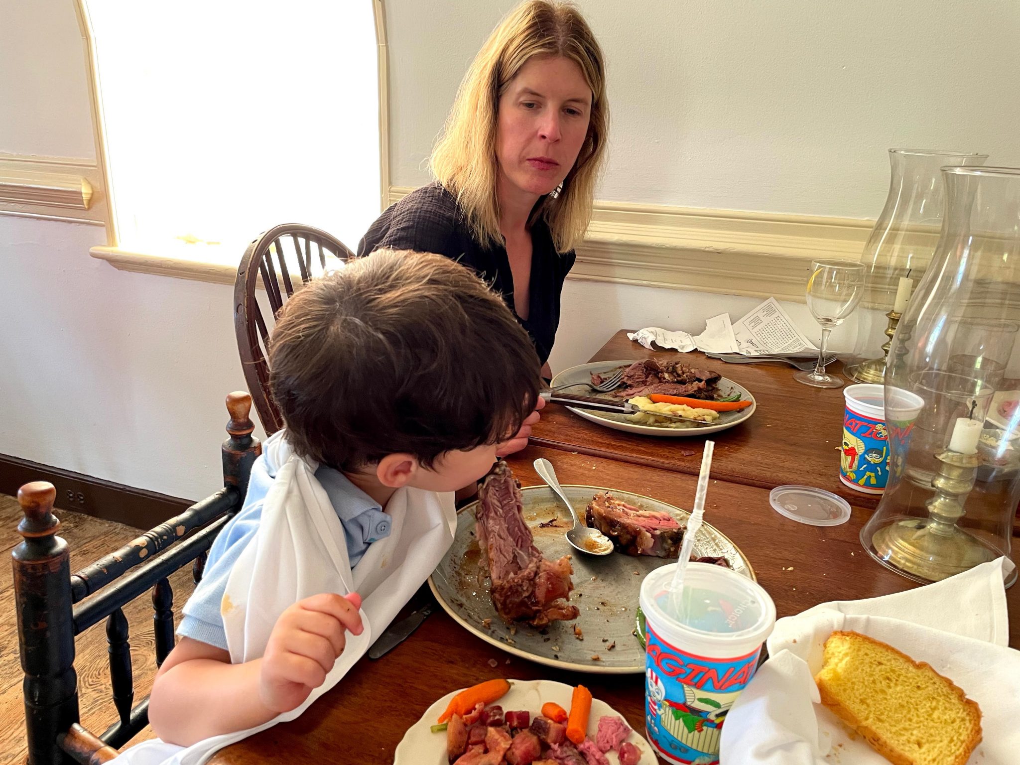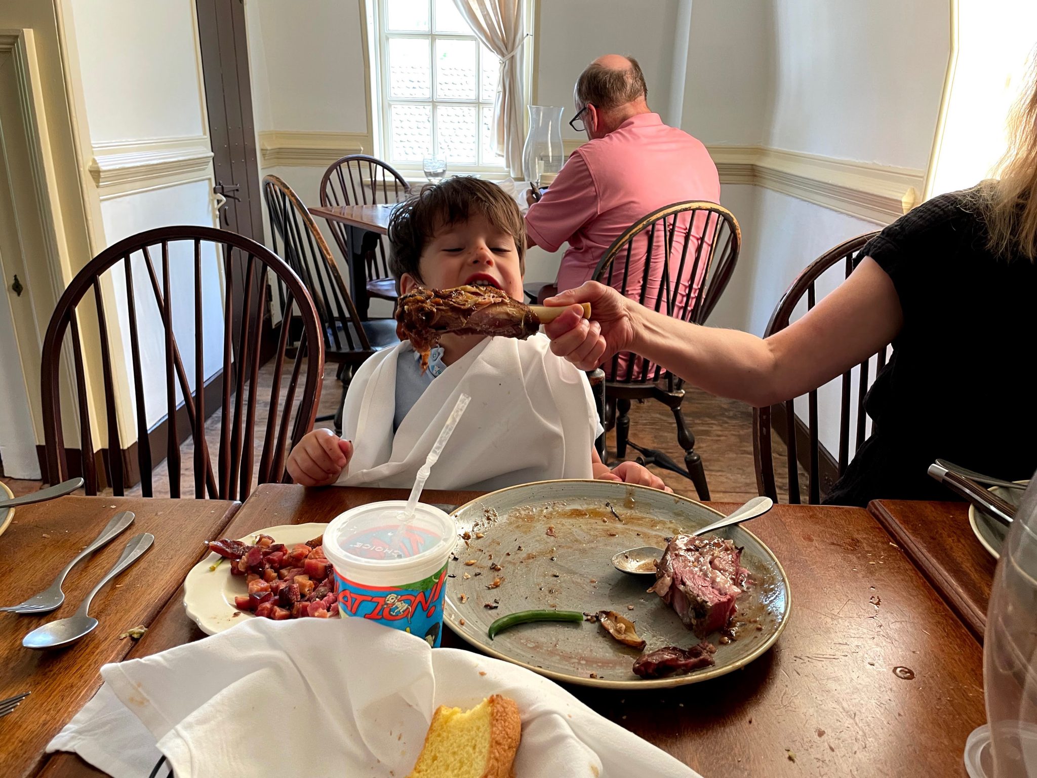Harry eating leg of lamb at the King’s Arms Tavern.