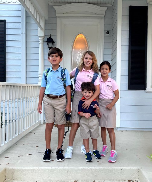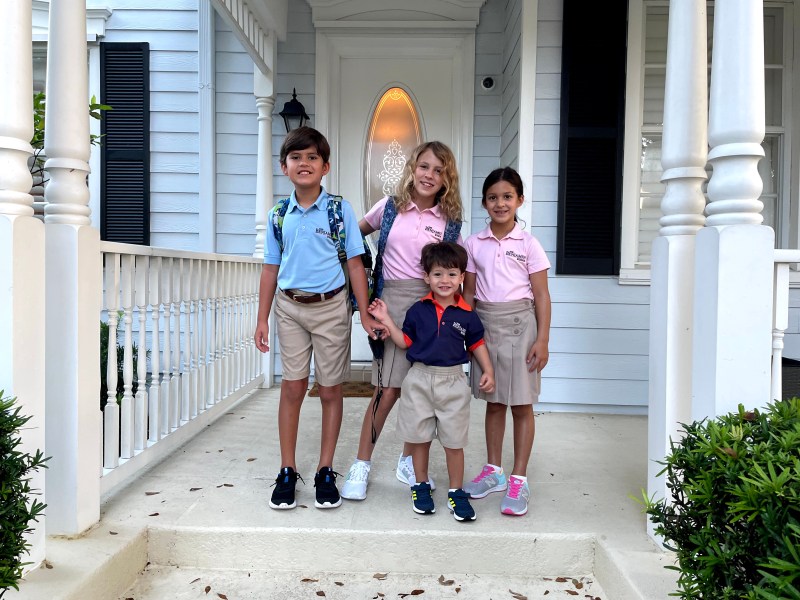 We finally moved in to our house a week ago and had a very successful first day of school. I picked Harry up first and asked “What was your favorite part of the day?” I thought he might say the playground time or something like that. He just said “school!” He loved it even though he had to wear a mask which he is not at all used to wearing. Here are some photos of the kids in their new Benjamin School uniforms. I wasn’t sure which photo was best so posted them all.